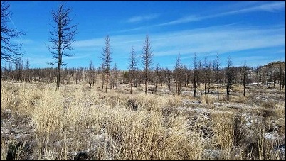 Note: All of these photos were taken January 2018. The land looks green on google, check the link, but the trees, still standing, are burned bad. Because of this we just lowered the price again! “End of the road privacy” with a small seasonal stream that meanders across the front portion of almost 2 football fields of land. (From snow run off in winter only.) This area had a fire a couple years back. Just a few scattered Blackened Ponderosa Pines. The lot does slope slight down-slope from the road. Perfect place to build. Zoned for one home. Animals OK. No power or phone close as of yet, but it does exist in the unit. National Forest close. Great area for riding.